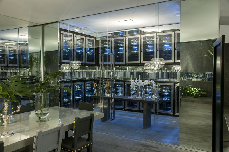 Brunete priorizou a iluminação natural, por meio de um pergolado com vidro da Guardian, que abriga um jardim de Marcelo Faisal. Para completar, pontos estratégicos de luz com luminárias da La Lampe. Destaque para o lustre de Philippe Starck para a Baccarat – Marie Coquine Chandelier.